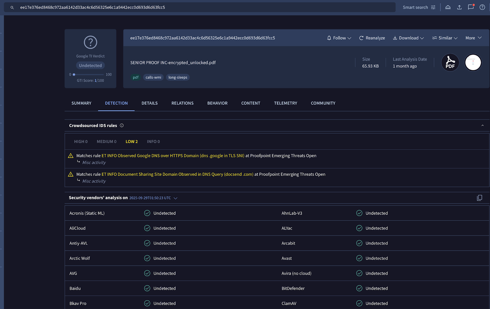 Zero-Day Detection Evasion: Crucially, VirusTotal did not flag this PDF as phishing or malicious. It passed through all vendor checks without a single warning (0/60 detection rate). This demonstrates that the attackers carefully crafted the file structure to stay under the radar of signature-based detection systems.