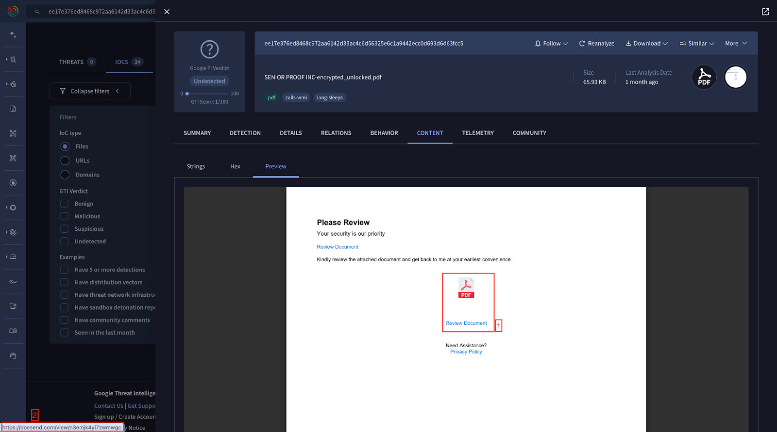 During our investigation on VirusTotal, we identified a PDF containing embedded malicious URLs. The PDF is engineered to leverage social engineering, using reassuring language like “Your security is our priority” to appear genuine. The visual design, featuring a prominent PDF icon and repeated ‘Review Document’ prompts, creates a sense of urgency, pushing the user into a "click-whirr" psychological response.