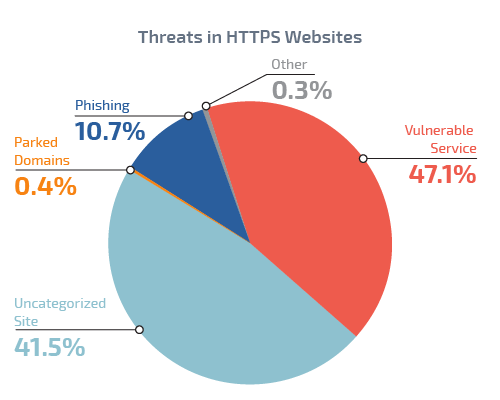 Breaking down the threats in https websites, we find that 47.1% of the https websites are running vulnerable server software (like an old version of Apache, Drupal, Wordpress, etc.)